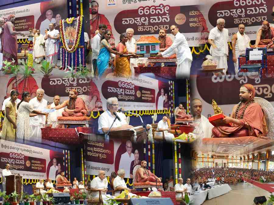 The 666th Vatsalya House Handover Ceremony was organized at Dharmasthala and the handover was given by Shri Shri Vidhushekhara Bharati Swamiji. The program was presided over by Dr. D. Veerendra Heggade ji. Along with the handover ceremony, under the Janamangala program, equipment was given to handicapped people and pension was given to destitute people. The program was attended by members of the self-help group and residents of the village.